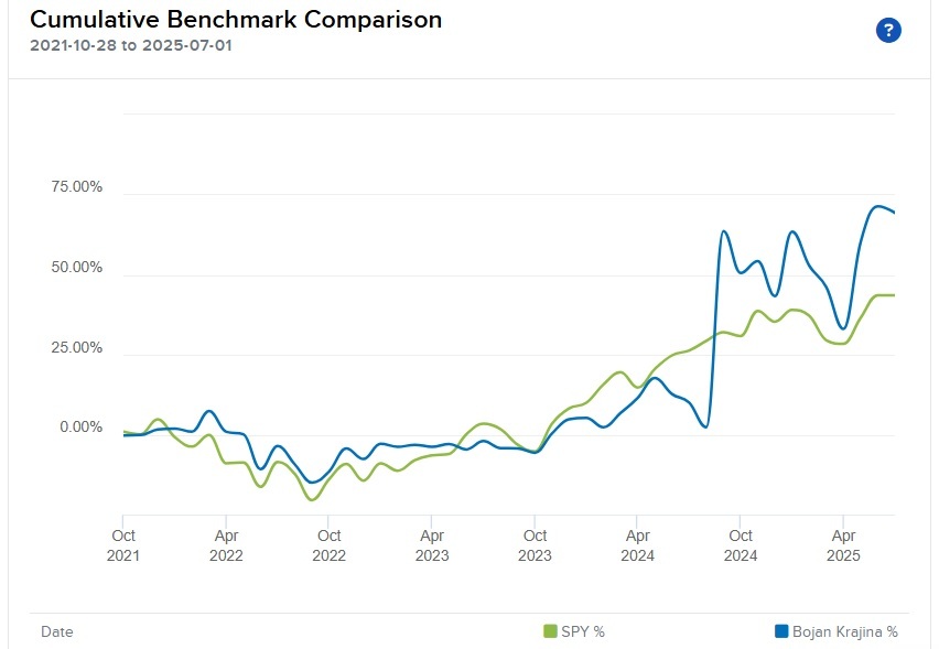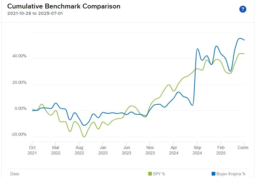 Na slikama u nastavku je prikazan performans mojih dionica počevši od datuma kupovine moje prve strane dionice (28.10.2021. god.) do 01.07.2025. godine, u poređenju sa SPDR S&P 500 ETF fondom (SPY - fond koji prati S&P 500 indeks), odnosno u pitanju je fond koji se sastoji od dionica 500 najvećih američkih kompanija. Inače, većina investitora poredi svoj performans sa ovim fondom ili sličnim. Oba screenshot-a su iz IBKR aplikacije. Postoje dva standardna načina mjerenja performansa dionica: „time-weighted returns“ (TWR) i „money-weighted returns“ (MWR). TWR je dobar kada želimo porediti svoj performans sa performansom fonda koji prati neki indeks, dok je MWR bolji za razumijevanje pojedinačnog performansa investitora. TWR mjeri uspješnost portfolia neovisno o tome kada se novac dodaje ili povlači, fokusirajući se isključivo na vještine investitora. S druge strane MWR uzima u obzir vrijeme i iznos novčanih uplata/isplata, odražavajući stvarno iskustvo investitora. Prema standardima, TWR je preferirana metoda izračuna performansa dionica.